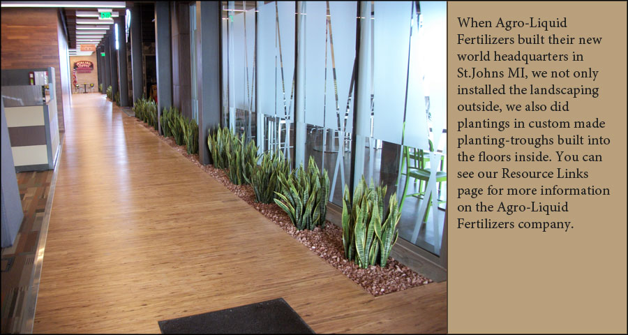 When Agro-Liquid Fertilizers built their new world headquarters in St.Johns MI, we not only installed the landscaping outside, we also did plantings in custom made planting-troughs built into the floors inside. You can see our Resource Links page for more information on the Agro-Liquid Fertilizers company.