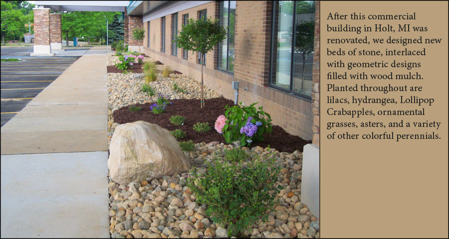 After this commercial building in Holt, MI was renovated, we designed new beds of stone interlaced with geometric designs filled with wood mulch. Planted throughout are lilacs, hydrangea, Lollipop Crabapples, ornamental grasses, asters, and a variety of other colorful perennials.