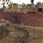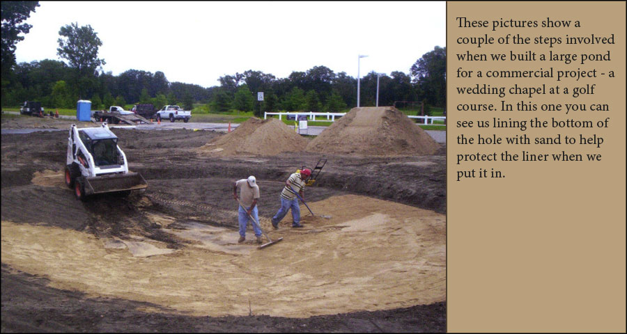 These pictures show a couple of the steps involved when we built a large pond for a commercial project - a wedding chapel at a golf course. In this one you can see us lining the bottom of the hole with sand to help protect the liner when we put it in.