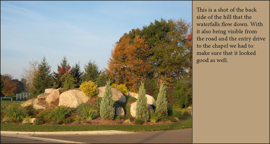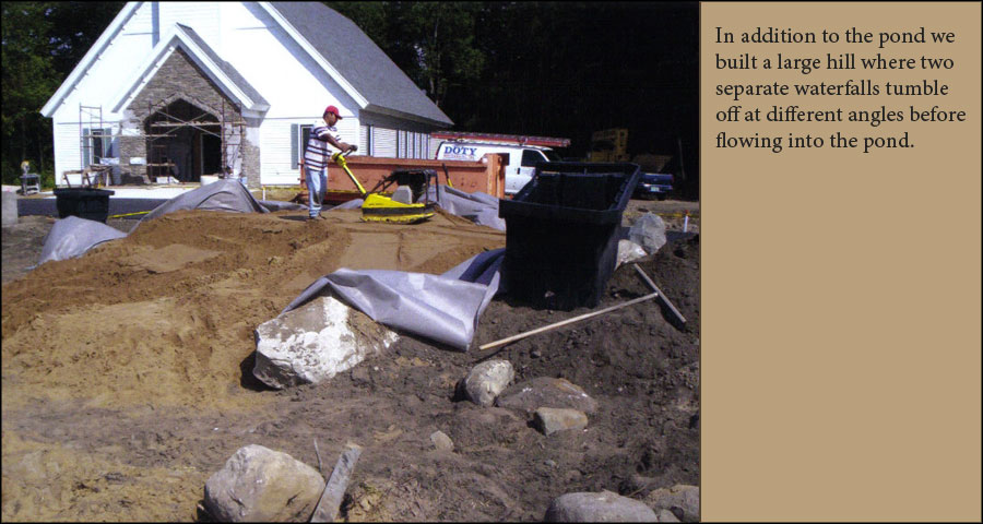 In addition to the pond we built a large hill where two separate waterfalls tumble off at different angles before flowing into the pond.