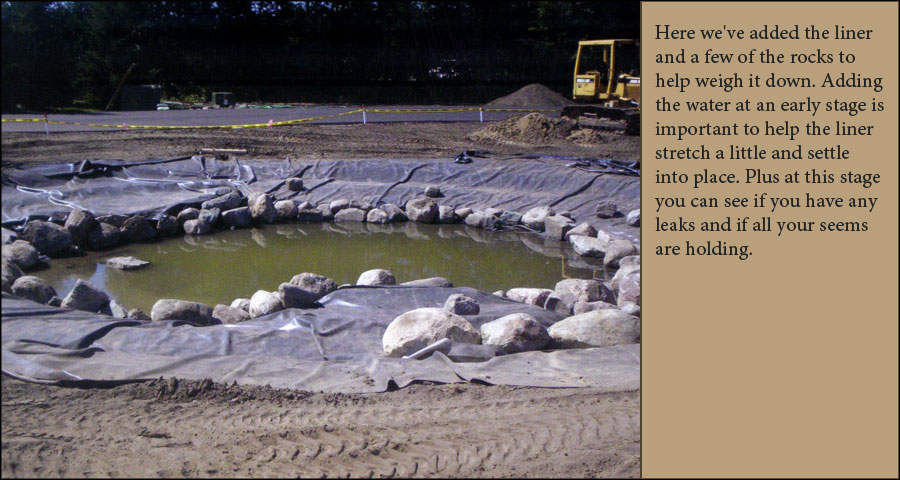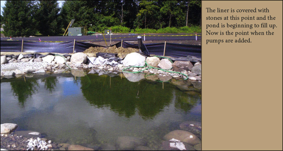 The liner is covered with stones at this point and the pond is beginning to fill up. Now is the point when the pumps are added.