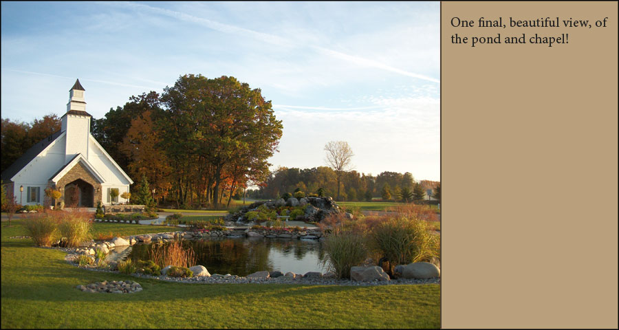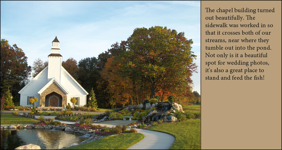 The chapel building turned out beautifully. The sidewalk was worked in so that it crosses both of our streams, near where they tumble out into the pond. Not only is it a beautiful spot for wedding photos, it's also a great place to stand and feed the fish!