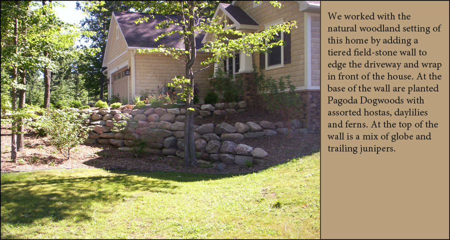 We worked with the natural woodland setting of this home by adding a tiered field-stone wall to edge the driveway and wrap in front of the house. At the base of the wall are planted Pagoda Dogwoods with assorted hostas, daylilies and ferns. At the top of the wall is a mix of globe and trailing junipers.