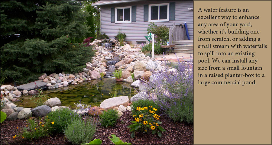 A water feature is an excellent way to enhance any area of your yard, whether it's building one from scratch, or adding a small stream with waterfalls to spill into an existing pool. We can install any size from a small fountain in a raised planter-box to a large commercial pond.
