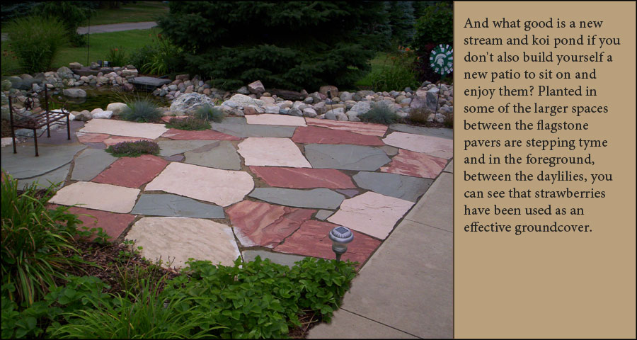 And what good is a new stream and koi pond if you don't also build yourself a new patio to sit on and enjoy them? Planted in some of the larger spaces between the flagstone pavers are stepping tyme and in the foreground, between the daylilies, you can see that strawberries have been used as an effective groundcover.