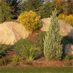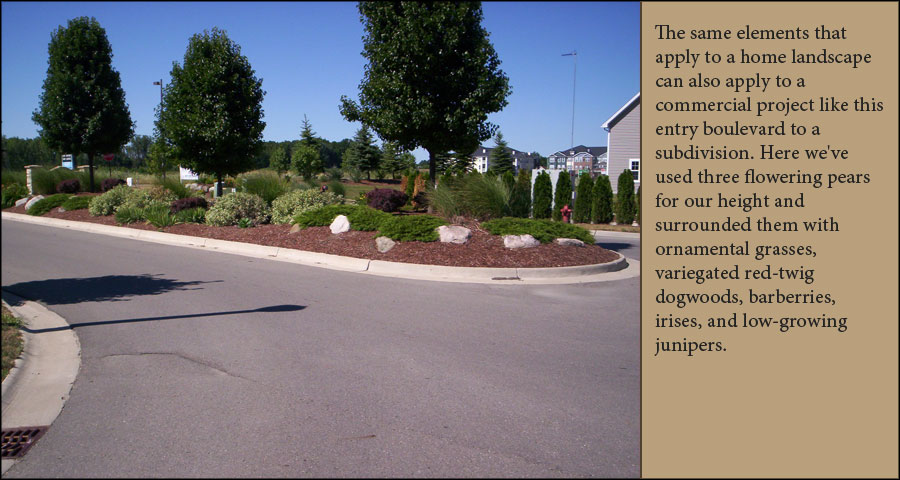 The same elements that apply to a home landscape can also apply to a commercial project like this entry boulevard to a subdivision. Here we've used three flowering pears for our height and surrounded them with ornamental grasses, variegated red-twig dogwoods, barberries, irises, and low-growing junipers.