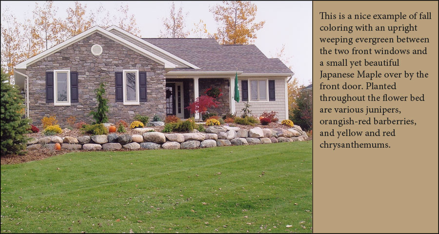 This is a nice example of fall coloring with an upright weeping evergreen between the two front windows and a small yet beautiful Japanese Maple over by the front door. Planted throughout the flower bed are various junipers, orangish-red barberries, and yellow and red chrysanthemums.