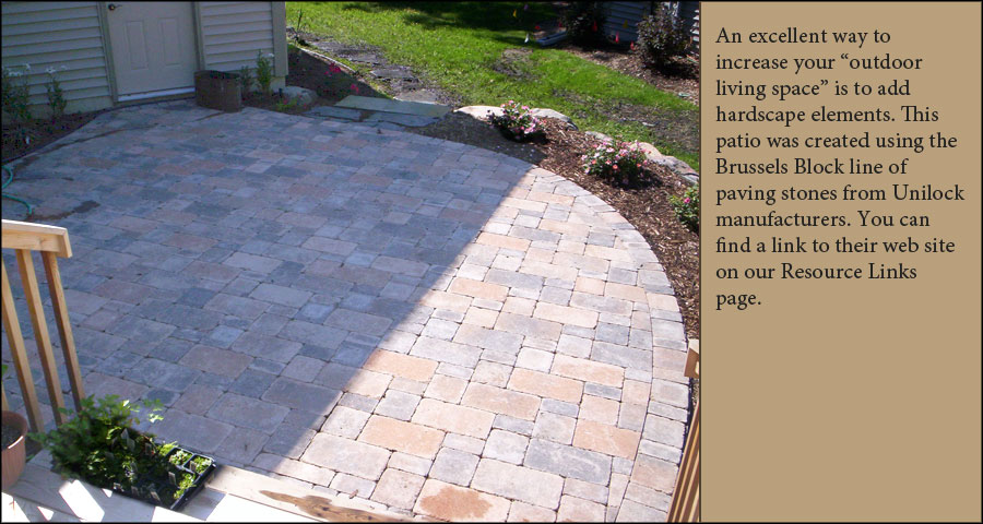 An excellent way to increase your "outdoor living space" is to add hardscape elements. This patio was created using the Brussels Block line of paving stones from Unilock manufacturers. You can find a link to their web site on our Resource Links page.