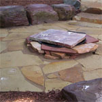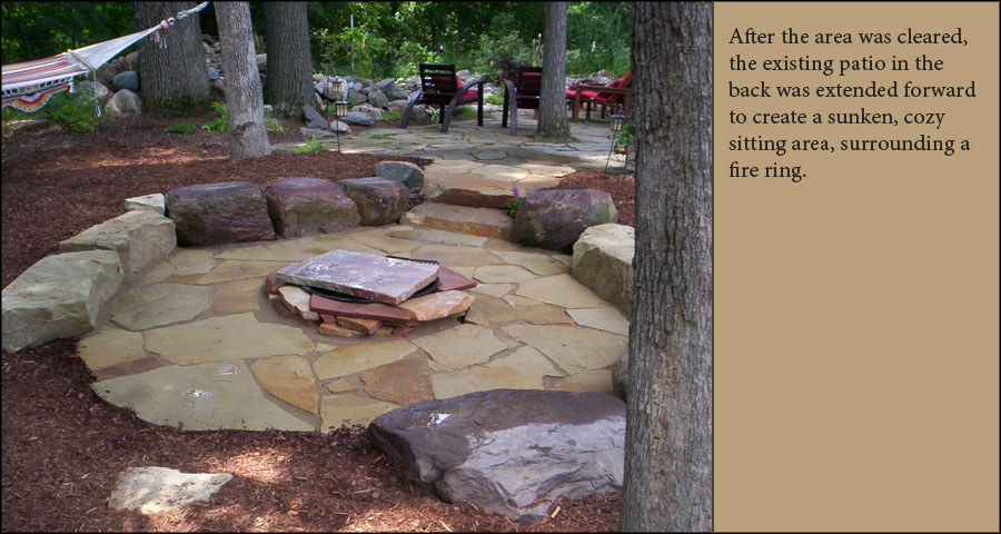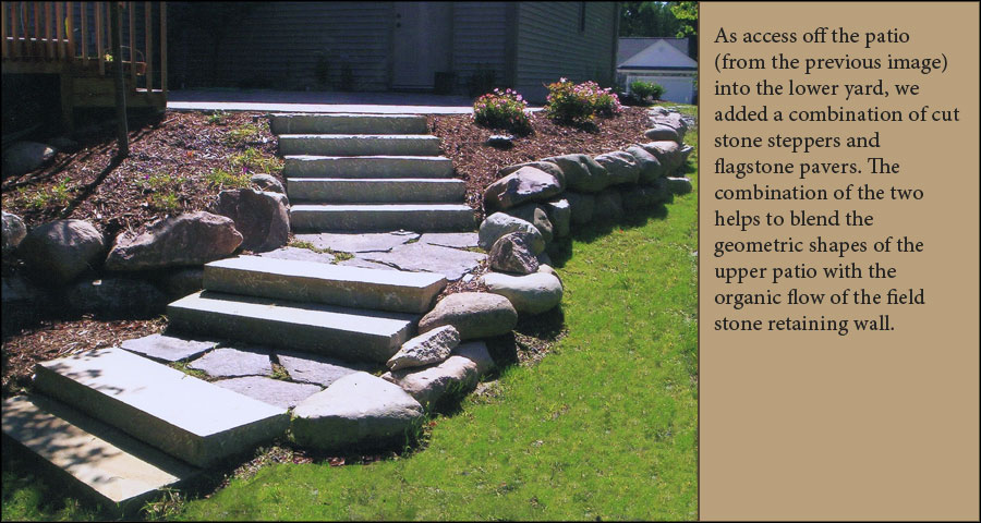 As access off the patio (from the previous image) into the lower yard, we added a combination of cut stone steppers and flagstone pavers. The combination of the two helps to blend the geometric shapes of the upper patio with the organic flow of the field stone retaining wall.