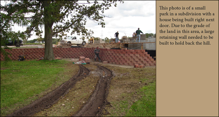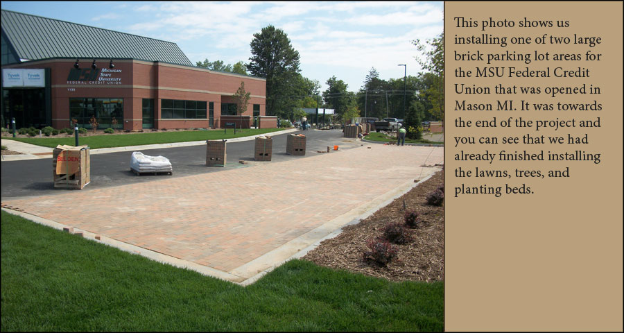 This photo shows us installing one of two large brick parking lot areas for the MSU Federal Credit Union that was opened in Mason MI. It was towards the end of the project and you can see that we had already finished installing the lawns, trees, and planting beds.