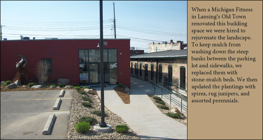 When a Michigan Fitness in Lansing's Old Town renovated this building space we were hired to rejuvenate the landscape. To keep mulch from washing down the steep banks between the parking lot and sidewalks, we replaced them with stone-mulch beds. We then updated the plantings with spirea, rug junipers, and assorted perennials.