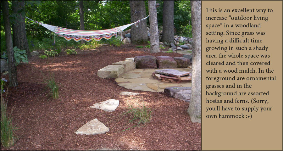 This is an excellent way to increase "outdoor living space" in a woodland setting. Since grass was having a difficult time growing in such a shady area the whole space was cleared and then covered with a wood mulch. In the foreground are ornamental grasses and in the background are assorted hostas and ferns. (Sorry, you'll have to supply your own hammock :1)